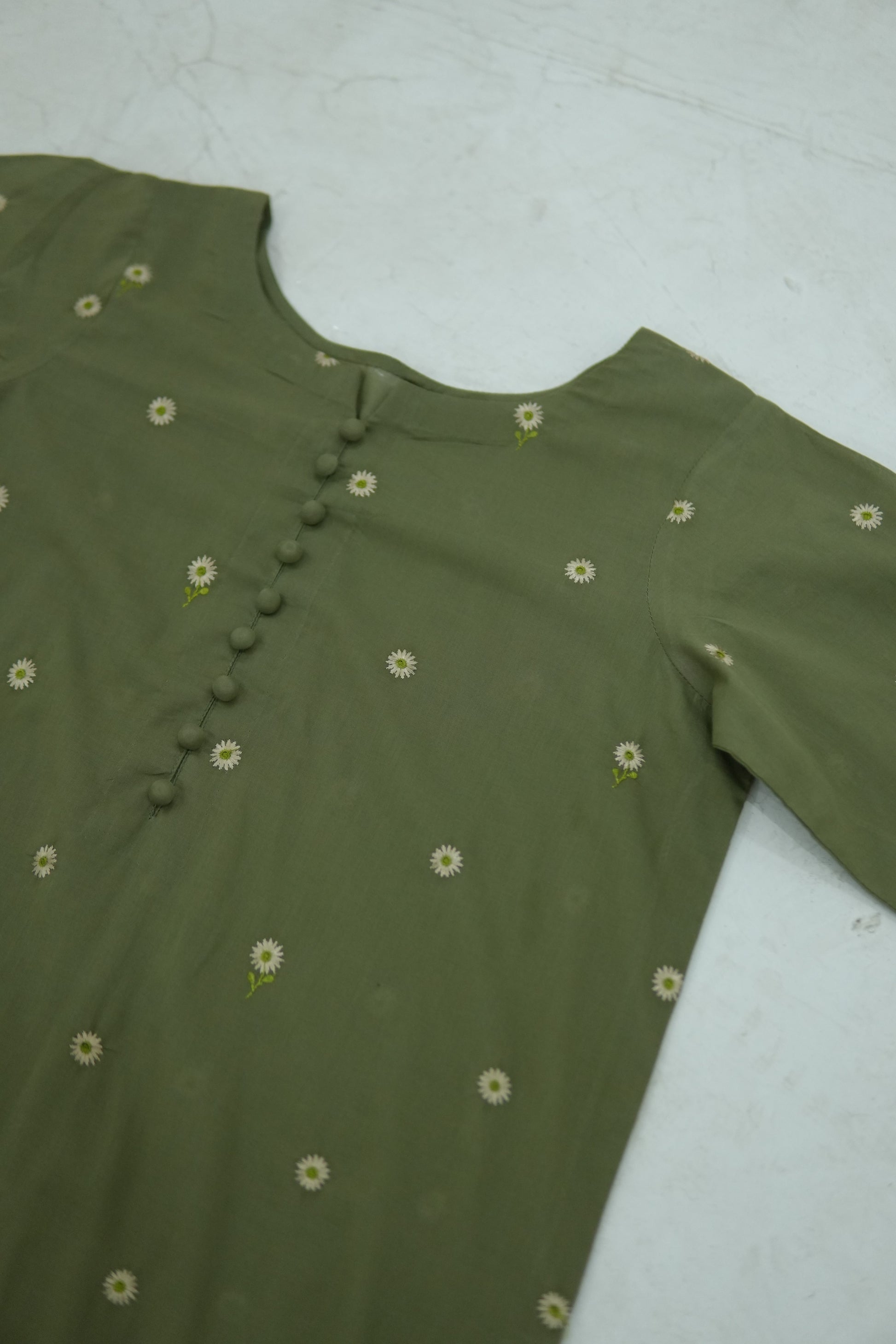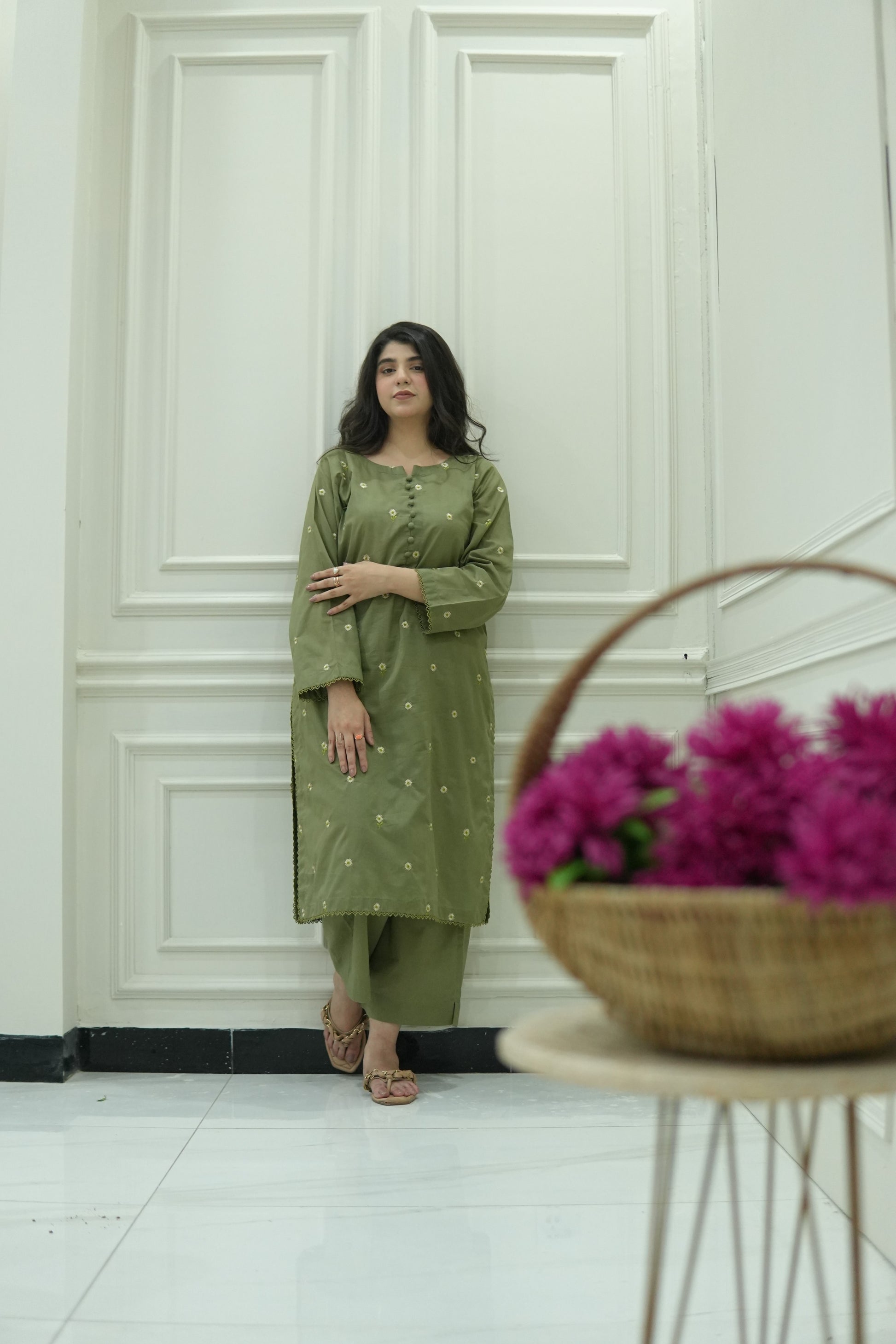 This sophisticated outfit includes a lawn shirt with intricate embroidery on the front, back, and sleeves, paired with a cotton lawn trouser, offering a refined and cohesive appearance.